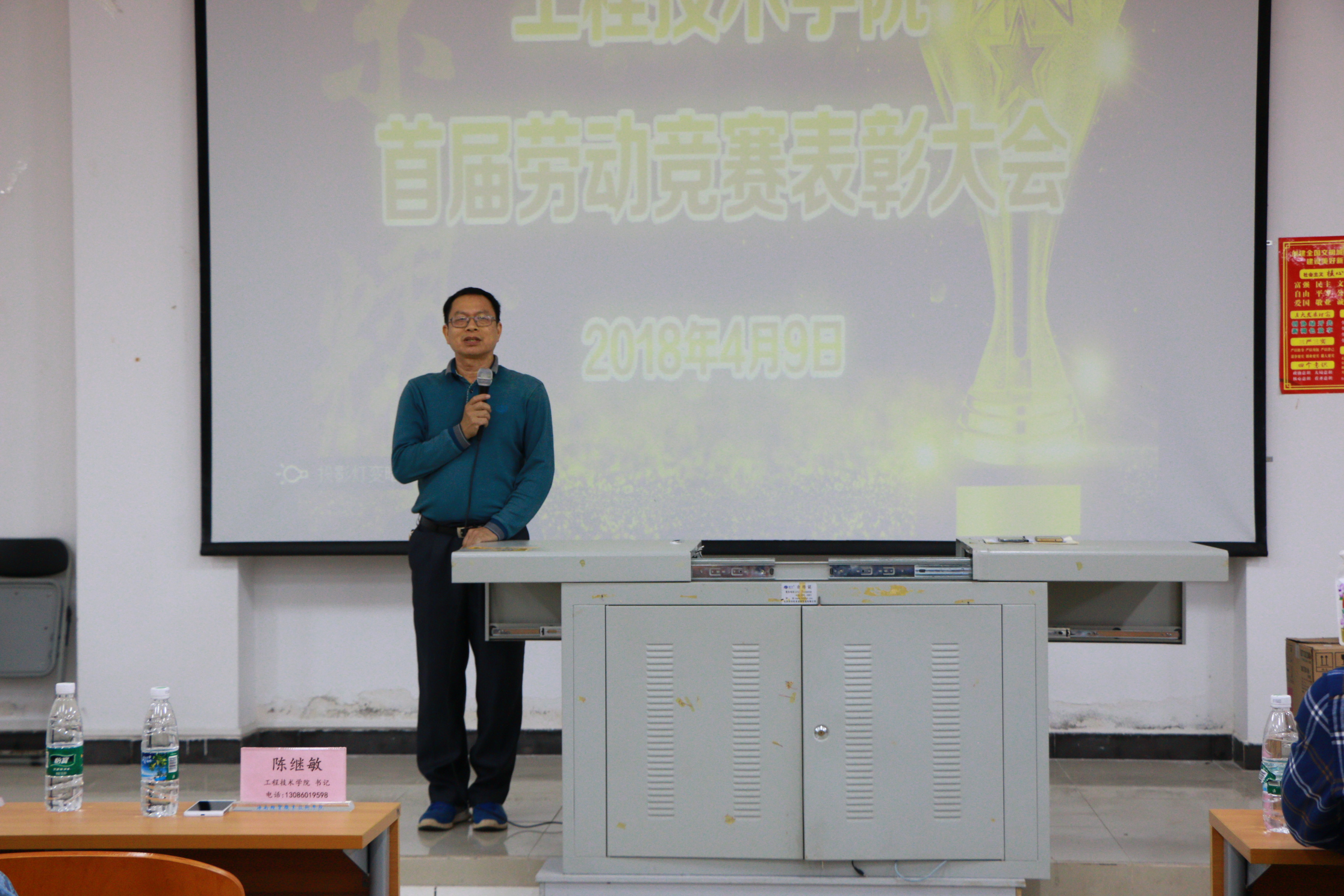为激发同学们的劳动热情,增强班级凝聚力,2018年4月9日晚19时,工程技术学院在2教408教室召开首届劳动竞赛表彰大会,工程技术公司党总支书记陈继敏、副书记陈亚芳、学工办主任梁其钰与各辅导员出席,全体2017级新生参加,辅导员周恺主持会议。