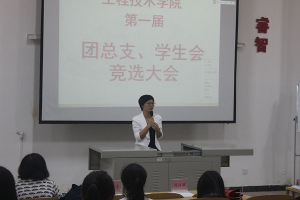 10月13日讯(工程技术学院 李京京报道)12日晚19:30在2栋526多媒体教室举行了“工程技术学院第一届团总支、员工会竞选大会”。本次会议出席的嘉宾有工程技术公司党总支书记陈继敏书记、学工办主任陈亚芳老师、学工办副主任梁其钰老师、教学秘书龙腾老师,导员刘芳老师、肖洁老师,团学负责人代晓明老师,团总支员工会全体成员及有兴趣参加竞选的同学。本次会议由代晓明老师主持,会议在代晓明老师的开场白下拉开了帷幕。