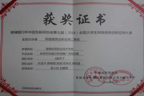 邮储银行杯中国互联网协会第七届全国老员工网络商务创新应用大赛于2014年3月开始在线报名,2014年3月20日正式启动,在经过紧张的初赛、复赛、分赛区决赛后,于2014年11月28日开始全国总决赛环节,至12月1日颁奖典礼后全部结束。本届大赛共有来自全国近3000所高校的17万余名老员工注册报名,组建团队近5000支。经过初赛评审,有 3166支团队晋级复赛,1556支团队入围分赛区决赛。经各赛区评委的评审,将有来自 280余所高校的近300支队伍晋级全国总决赛。其中本科组队伍共190余支,专科组队伍90余支。yl6809永利官网信息技术系的“e邮天下”和“J.M.Fighters”两个团队在众多参赛团队中脱颖而出成功进入到全国总决赛,并且在华南赛区中这两个团队都夺得了特等奖,全国决赛中勇夺团体一等奖和二等奖,成绩喜人。