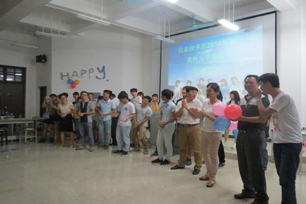 本系9月12日讯(信息技术系 丁燕琴报道)9月11日晚7:30,我系在2-408教室举行了以“我的大学我做主”为主题的2014级新生见面晚会,出席嘉宾有:我系党总支书记陈继敏书记、系学工办主任陈亚芳老师、系主任王忠老师、系办公室主任周波老师、系教学秘书吴明珠和韩昌豪老师、系学工办副主任梁其钰和刘露思老师、系副主任王凡帆、计算机网络技术专业负责人王岩、电子商务专业负责人单继周、计算机多媒体技术专业负责人李兵、辅导员龙腾老师。其中由员工会全体人员和14级各班代理班主任进行布置现场以及维持现场秩序。